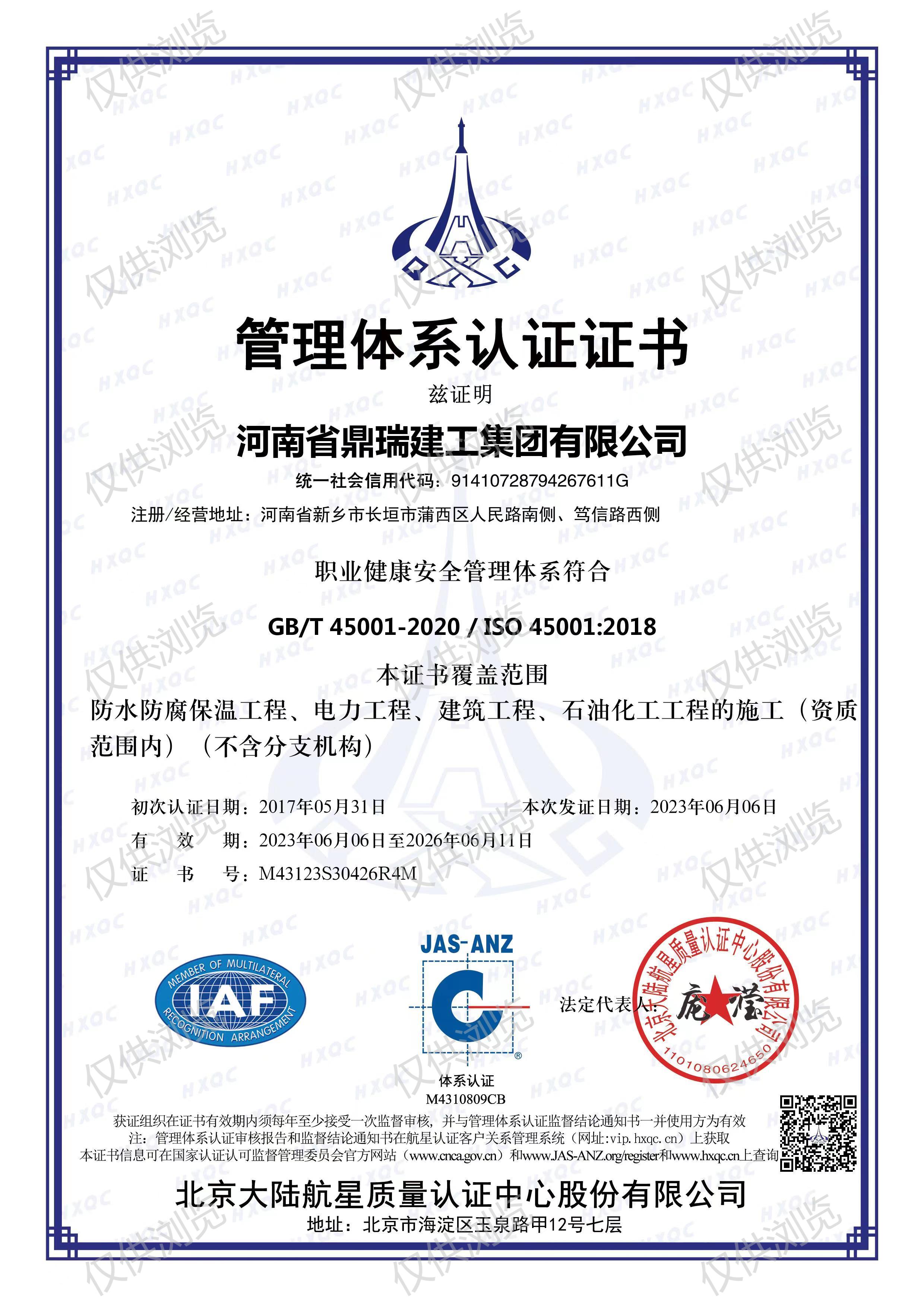 職業(yè)健康安全管理體系認證證書
